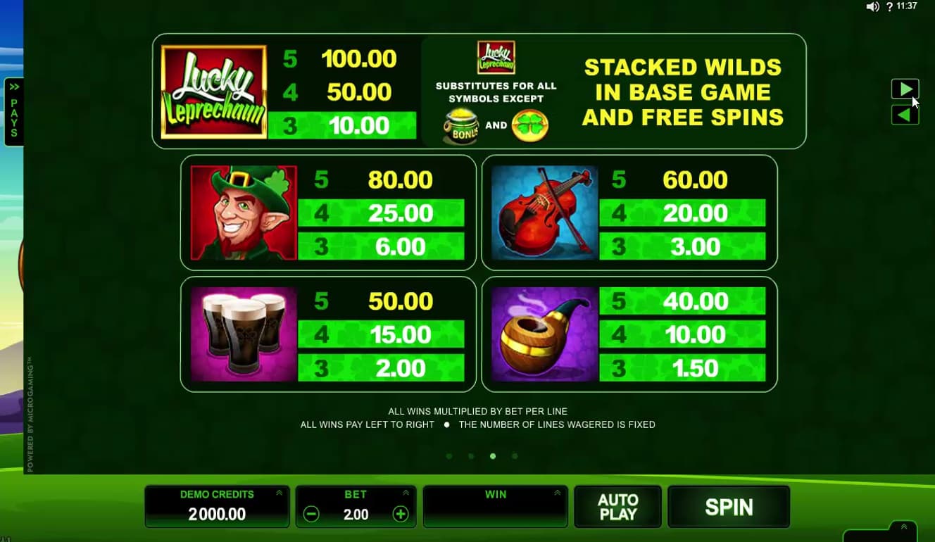 Το Lucky Leprechaun είναι ένα παιχνίδι εμπνευσμένο από την Ιρλανδία, το οποίο βασίζεται στη θρυλική τύχη αυτής της χώρας και στους θρύλους τους. Σε καμία περίπτωση δεν είναι μια μοναδική προσφορά σε αυτήν την αγορά, αντίθετα, με πολλούς ανταγωνιστές να έχουν το ίδιο θέμα. Το Lucky Leprechaun έχει σχεδιαστεί από την Microgaming και κυκλοφόρησε το 2015 ως παιχνίδι με μεσαία διακύμανση. Οι 5 τροχοί παίρνουν συνολικά 20 ενεργές γραμμές και οι ανταμοιβές που προέρχονται από τους συνδυασμούς τους μπορούν να φτάσουν σε τιμές έως και 25.000 $, ενώ τα παιχνίδια μπόνους μπορούν να κάνουν ακόμη καλύτερα. Για τις δυνατότητες που χρησιμοποιούνται σε αυτήν την περίπτωση, η Microgaming επέλεξε να βασιστεί σε στοιβαγμένα μπαλαντέρ, σε scatter, παιχνίδια μπόνους, δωρεάν περιστροφές και πολλαπλασιαστές.