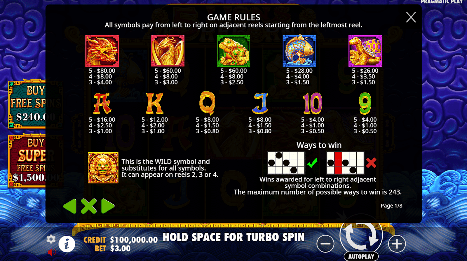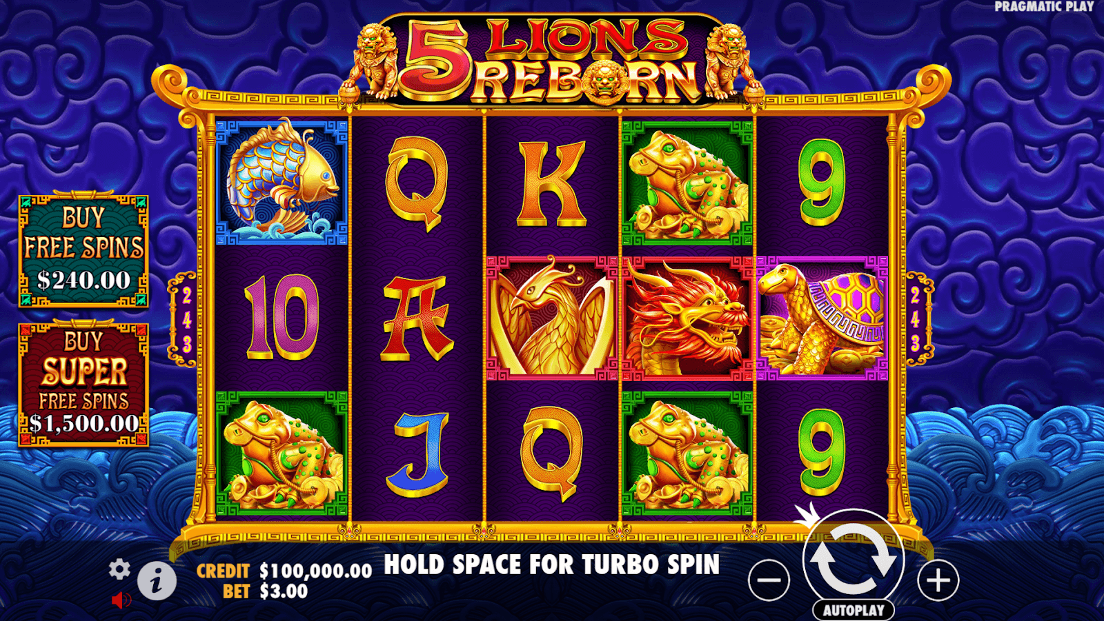 5 Lions Reborn, που αναπτύχθηκε από Πραγματικό παιχνίδι, είναι ένας σαγηνευτικός κουλοχέρης υψηλής μεταβλητότητας που προσκαλεί τους παίκτες σε έναν μυθικό ναό νεφρίτη γεμάτο χρυσά θηρία. Περιστρέφεται σε ένα πλέγμα 5 × 3 με 243 τρόπους νίκης, γενναιόδωρο RTP 96,50% και πονταρίσματα από 0,30€ έως 240€. Το Turbo και οι 1-1 000 αυτόματες περιστροφές διατηρούν το ρυθμό γρήγορο, ενώ ένα Feature Buy (80 × για κανονικές δωρεάν περιστροφές ή 500 × για Super Free Spins) προσφέρει άμεση αδρεναλίνη. Ο ενθουσιασμός του βασικού παιχνιδιού προέρχεται από τα στοιβαγμένα ασφάλιστρα και τα μπαλαντέρ δράκων που φέρουν τυχαίους πολλαπλασιαστές 2-35 ×.