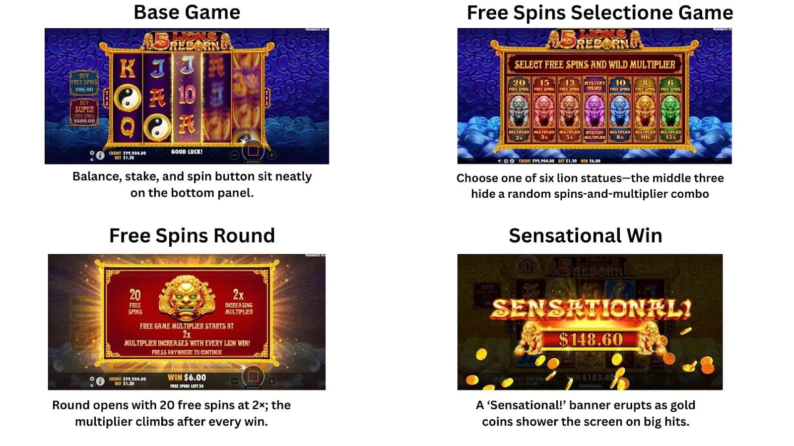Το 5 Lions Reborn διαθέτει πλούσια, λεπτομερή γραφικά με επίκεντρο ένα σκηνικό ναού από νεφρίτη, όπου τα σύμβολα φοίνικα, χελώνας και koi λάμπουν σε περίτεχνο χρυσό φιλιγκράν. Οι λεπτές εκλάμψεις σωματιδίων και οι εκρήξεις φωτός προσθέτουν μια στιλβωμένη, δυναμική αίσθηση χωρίς να ξεπερνούν την παραδοσιακή κινεζική αισθητική.
